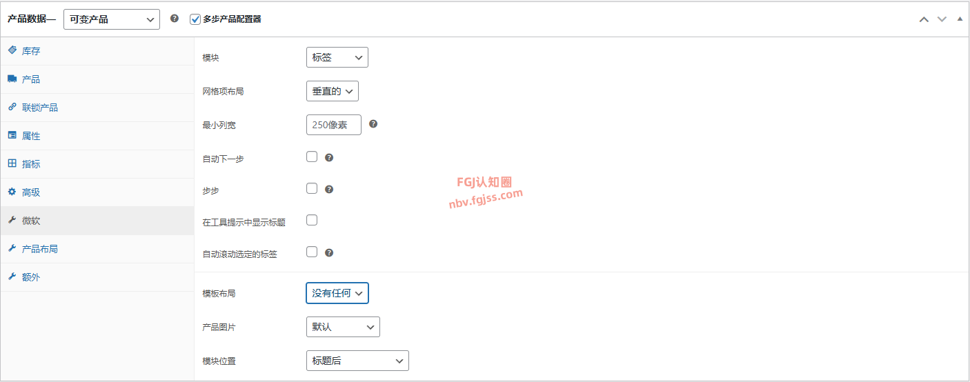 插件安装后,在WooCommerce选项下 – 添加新产品进入产品编辑页面,在下方的功能项选择“可变产品”,右上角将会出现多步骤产品配置器,根据自身需求设置即可: