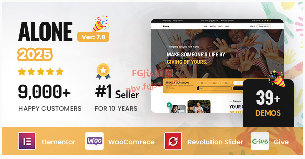 Alone慈善多功能非营利WordPress主题由Bearsthemes团队开发,在ThemeForest平台上已售出10,150份,持续获得用户高度评价。